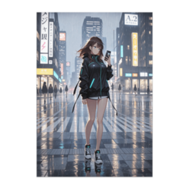 ポスター - B2この商品はpixivFACTORYで作られた商品です。サンプル画像は完成イメージのため、実物と異なる場合があります。 雨に濡れた街に反射する光の中、スマートフォンを見つめる彼女。都会の孤独と静けさを映し出すワンシーンを切り取ったシネマチックな一枚です。