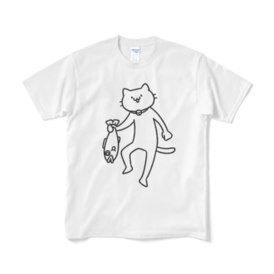 【デカねこ】魚を持ち帰る猫(大プリント/線画)Tシャツ