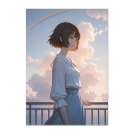 ポスター - B2この商品はpixivFACTORYで作られた商品です。サンプル画像は完成イメージのため、実物と異なる場合があります。 雨雲の切れ間から差し込む光と、現れた虹。その下でほほえむ少女は、穏やかな決意を胸に未来を見つめています。やさしい色調で描かれた、雨上がりの一瞬の輝きをポスターにしました。
