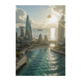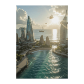 ポスター - B2この商品はpixivFACTORYで作られた商品です。サンプル画像は完成イメージのため、実物と異なる場合があります。 海と空が溶け合う幻想の港町。輝く水面に浮かぶ帆船と未来的な街並みが、異世界の旅へと誘います。