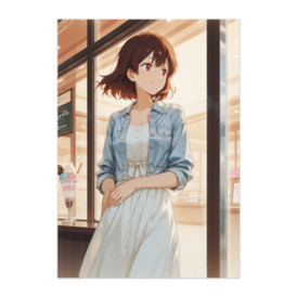 ポスター - B2この商品はpixivFACTORYで作られた商品です。サンプル画像は完成イメージのため、実物と異なる場合があります。 街角のアイスクリームショップに立つ彼女。 夕暮れの光がガラス越しにきらめき、やわらかな風が髪を揺らす。 日常の中の小さな幸福を、アニメのような光と色で描いた作品です。