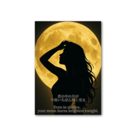 フォト風カード - 縦 - 片面(1)君の中の月が 今夜いちばん強く光る Even in silence, your moon burns brightest tonight. ― #月と彼女 シリーズより 静寂の夜、彼女の胸に宿る光を描いた一篇。 Kenmax Poetry Works の世界観を象徴する詩画作品です。 ・フォト風カード(光沢仕上げ/片面フルカラー) ・サイズ:約63×89mm ・1枚ずつpixivFACTORYでオンデマンド印刷 ・裏面は白無地(メッセージ記入可) 📦 この商品はpixivFACTORYで製造されています。 ※掲載画像は完成イメージのため、実物と色味が異なる場合があります。