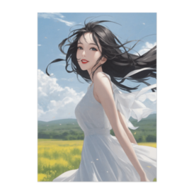 ポスター - B2この商品はpixivFACTORYで作られた商品です。サンプル画像は完成イメージのため、実物と異なる場合があります。 青空と草原の中、風を受けて微笑む女性。白いドレスと黒髪が風に揺れ、赤い唇が幸福の瞬間を描き出します。ランドスケープが生む透明感と開放感に満ちた作品。