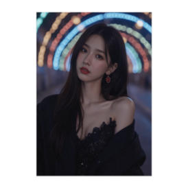 ポスター - B2この商品はpixivFACTORYで作られた商品です。サンプル画像は完成イメージのため、実物と異なる場合があります。 虹色の光のアーチを背に、彼女は静かに立ち尽くす。 黒いドレスがイルミネーションの輝きを映し出し、 まるで時間が止まったかのような幻想的な夜を描くポートレートアート。