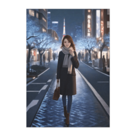ポスター - B2この商品はpixivFACTORYで作られた商品です。サンプル画像は完成イメージのため、実物と異なる場合があります。 青く輝く街路樹が並ぶ東京の冬の夜。 遠くに見えるタワーの灯りが、都会の静けさを優しく照らします。 洗練された女性の姿が美しく映える一枚です。