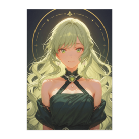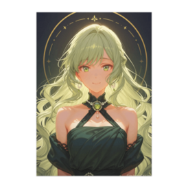 ポスター - B2この商品はpixivFACTORYで作られた商品です。サンプル画像は完成イメージのため、実物と異なる場合があります。 深いエメラルドのドレスを纏い、静かに微笑む女性。 幻想的な光が彼女を包み込み、気品と優雅さを際立たせる。 高貴な雰囲気漂う、アニメ調の美しいポスター作品。