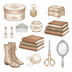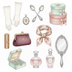 時を超えて愛され続ける、エレガントでノスタルジックなレトロコスメの魅力を、繊細な水彩画タッチで表現したクリップアートコレクションです。手鏡、香水瓶、コンパクト、ブラシ、リップスティック、真珠のネックレス、手袋など、古き良き時代の女性たちが愛用した美しいアイテムを厳選し、一つ一つ丁寧に描き上げました。