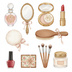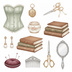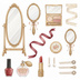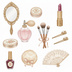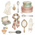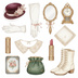 姿見、手鏡、香水瓶、コンパクト、パフ、ブラシ、リップスティック、真珠のネックレス、ヘアピン、手袋、靴、帽子、レースの襟、スカーフ、懐中時計、裁縫箱、ハサミ、本、ランジェリー、クッションなど、レトロコスメや当時のファッション、小物にまつわる様々なアイテムが多数含まれています。(商品画像をご確認ください)