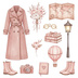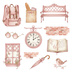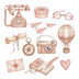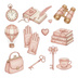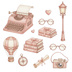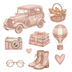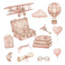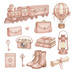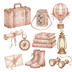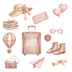 【水彩画風】ピンクなレトロ旅行 クリップアートコレクション (PNG形式)