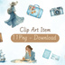 水彩×水色×アンティーク「旅する女性と旅アイテム」クリップアートセット【PNG】
