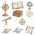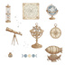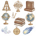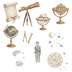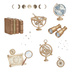 地球儀、天体図、コンパス、望遠鏡、星、月の満ち欠けなど、天体に関するアイテムが多数含まれています。(商品画像をご確認ください)