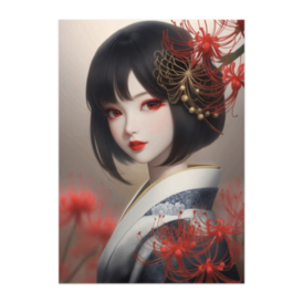 ポスター - B2この商品はpixivFACTORYで作られた商品です。サンプル画像は完成イメージのため、実物と異なる場合があります。 金の髪飾りと赤い彼岸花に包まれ、静かに微笑む和ドールの横顔美。 濃紺の着物が上品に映え、柔らかな光が少女の横顔を優しく包む、幻想的で気品あるアート作品です。 和室にも洋室にも飾りやすい高級感のある一枚。