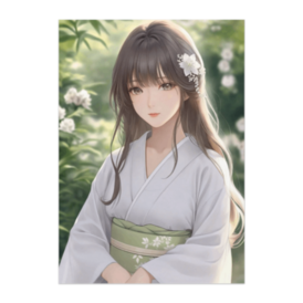ポスター - B2この商品はpixivFACTORYで作られた商品です。サンプル画像は完成イメージのため、実物と異なる場合があります。 柔らかな緑に包まれた庭で、白い着物をまとった清楚な少女が優しく微笑むイラストです。淡い緑の帯と白花の髪飾りが、自然の光と美しく調和しています。透明感のある癒しの和風アートとして、ポスターにも最適の一枚です。