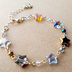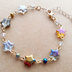 ---------------------------------------------------------------------------------- こちらは【イベントに夢中!7ー魔法に夢中2ー】に出品の作品です。 今回は新作として星モチーフを中心にポップな性格の魔女のアクセサリーをイメージして作りました。 同イベントには過去作と併せて出品しています。 ---------------------------------------------------------------------------------- 虹色にメッキ加工された小さな星型ガラスビーズを多面カットの小さなガラスビーズとともに連ねたブレスレットです。 アジャスターの先にはポイントとして星モチーフの小さなメタルチャームを繋げました。 ※金属アレルギー、メッキ加工が肌に合わない方は注文をお控えください。 【サイズ等の仕様】 全体長さ アジャスター部分を含まず約17cm(アジャスター約4cm)