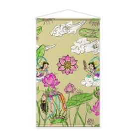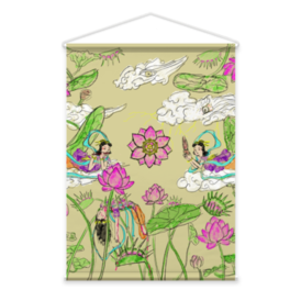 タペストリー - 特大(70 x 120cm)古の仏画のような蓮花の曼荼羅。法輪を讃えるように舞う飛天と、周りを取り囲む蓮の花と葉そして怪しげな植物を描きました。一切は、穢れなく、穢れなくもなく、完全でなく、不完全でもない。