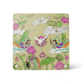 アクリル時計 - 150x150mm古の仏画のような蓮花の曼荼羅。法輪を讃えるように舞う飛天と、周りを取り囲む蓮の花と葉そして怪しげな植物を描きました。一切は、穢れなく、穢れなくもなく、完全でなく、不完全でもない。
