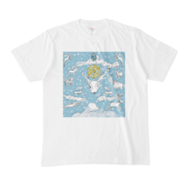 Tシャツ - XL - 白チベット寺院の屋根を飾る象徴 法輪と鹿を中心にヒマラヤに生きる動物たちを配置したオリジナルアート。背景には、さまざまな結晶を散りばめた雪が静かに輝き、 高山の清らかな空気と、生命のつながりを感じさせます。