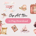 ✨ クリップアート商品説明(PNG形式明記つき) 淡いピンクの水彩タッチで描かれた、アンティークで可愛い “若い女性の旅行シリーズ” クリップアートセットです。 柔らかく優しい色合いと繊細な筆の表現で、旅のワクワク感や女性らしい雰囲気を丁寧に表現したイラスト素材となっています。 パスポート・スーツケース・カメラ・ホテルキー・地球儀・飛行機・船など、 旅行モチーフと若い女性を組み合わせたデザインで、 日記デコ、ジャーナル、SNS投稿、ポスター、教材、ステッカー作りなど、幅広い制作にご利用いただけます。 背景は透過済みで、使いやすいPNG形式でダウンロードいただけます。 そのまま貼るだけで作品が華やかになり、どんなデザインにも馴染みやすいセットです。 ⸻ ✨ 特徴 • 水彩タッチの柔らかな質感 • ピンク基調のフェミニンで可愛い配色 • アンティーク風の落ち着いた雰囲気 • 若い女性+旅行アイテムの組み合わせ • 透過PNGで扱いやすく、重ねたり編集しやすい ⸻ ✨ 使用例 • 手帳・日記・ジャーナルのデコレーション • SNS投稿のワンポイント、ヘッダー制作 • ブログやweb制作の素材 • 教材・プリントのイラスト • ステッカー・レター・カード作り • ポスター・フライヤーデザイン