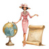 水彩タッチの旅する女の子クリップアート|ピンクで可愛い旅行テーマ11点セット|PNG背景透過