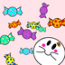 笑顔のおもちちゃんと、色とりどりのキャンディが散りばめられた