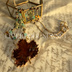 11/29 17:30に販売開始します 本物の葉っぱを閉じ込めたビンテージのブローチを飾ったネックレスです。 青緑色の下水道・月明かりに照らされるエリザベスのドレス・蝋燭の暖かい小さな光・足元を覆う闇を表現するビーズは、チェコビーズ(ガラス)とレッドタイガーアイを使用しています。 ブローチはロンドンの蚤の市で買ったものです。 古いもののため、金属部分に緑青(ろくしょう・緑色の錆)が部分的に出ていたり、葉っぱに色斑があったりします。「ここ汚いな」とか「ここボロいな」って思う部分を直そうとせず極力触らずにいられる人以外は購入しないでください。(アクセサリーとして着用する分にはもちろんまったく問題のない品物です🍁) 古い・天然の素材・私が作ったものではないという点で、私は修理することができません。 ブローチは取り外すことができ、ブローチ単体で使用したり、ネックレスに別のペンダントトップを通して使用することができます。 ガラスのジュエリーケースに入れてお届けします📦 ネックレスの長さ : 58cm(5.5cmのアジャスター付き) ブローチ(ペンダントトップ)の大きさ : 縦4.4cm/横4.7cm