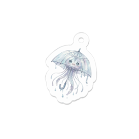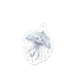 アクリルキーホルダー - 70 x 70 (mm)この商品はpixivFACTORYで作られた商品です。サンプル画像は完成イメージのため、実物と異なる場合があります。 雨上がりの駅前などでよく見かける、持ち主を失ったビニール傘。 遠目には少し寂しげな傘ですが、近づくと、傘の骨の部分がクラゲの体のスジになっていて、本来の持ち手の部分が、だらんと垂れ下がった「触手(口腕)」になっています。 全体的に半透明でフワフワと少しだけ宙に浮いており、「誰か拾ってくれないかな…」と捨て犬のようなオーラを出しています。乾くと干からびてしまうので、雨の日しか活動できません