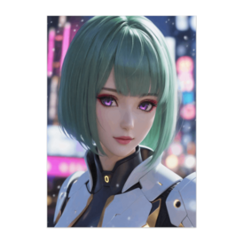 ポスター - B2この商品はpixivFACTORYで作られた商品です。サンプル画像は完成イメージのため、実物と異なる場合があります。 ネオンが瞬く都会の夜を背景に、ミントグリーンの髪と紫の瞳が印象的なサイボーグ少女を描いたポスター作品です。柔らかな表情とメタリックなアーマーの対比が美しく、近未来とファンタジーが交錯するような世界観を表現しています。部屋のアクセントとしてもおすすめの一枚です。