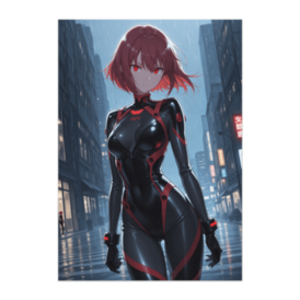 ポスター - B2この商品はpixivFACTORYで作られた商品です。サンプル画像は完成イメージのため、実物と異なる場合があります。 赤い閃光のような瞳を持つサイバー系ヒロインが、雨に濡れた近未来都市に立つイラスト風ポスター作品です。ブラック×レッドのスーツと無機質な街の光が対照的で、クールな存在感を放ちます。SF・サイバーパンク系が好きな方におすすめの一枚です。