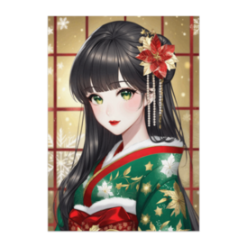 ポスター - B2この商品はpixivFACTORYで作られた商品です。サンプル画像は完成イメージのため、実物と異なる場合があります。 クリスマスカラーを纏った緑の着物に、華やかなポインセチアの髪飾りを添えた女性の冬ポスター。 金色の障子背景が暖かく輝き、ホリデーシーズンらしい上品な華やかさを演出します。 和とクリスマスの調和が美しい一枚です。