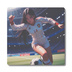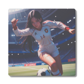 コースター - 角形スタジアムの熱気の中、赤をアクセントにした白いユニフォームで力強くボールへ向かう14番を描いた、迫力あるデザインコースターです。 真剣な眼差しとダイナミックな動きが印象的で、スポーツの情熱が伝わる一枚に仕上がっています。