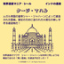 52mm×52mm オリジナルシール / 裏書モノクロ 通常シール 1枚 ※BOOTH倉庫発送のため、送料は何枚買っても一律です。1枚よりも 2〜3枚まとめて購入したほうが実質お得! ■内容 ・世界遺産「タージ・マハル」をイメージしたイラストです。 ※あくまでもイメージのため、細部は異なる場合があります ・シール裏面には、世界遺産マニアによる解説文を収録しています。 ■仕様 ・オンデマンド印刷(高品質カラー) ・PP加工あり(ツヤあり) ・1枚ごとにカット済み ・BOOTH倉庫から匿名配送(ネコポス) ■発送・注意事項 ・BOOTH倉庫利用のため、ご購入後、自動発送されます(土日祝・長期休暇を除く) ・自作シールのため、裁断のわずかなズレや印刷の濃淡など個体差があります。いずれも許容範囲内としてご了承ください。 ・会計後の追加注文による送料の重複分は返金できませんのでご注意ください。 ■その他 このシールは「世界遺産マニア」企画の一部であり、学術資料とは異なるファンによるコンテンツです。記載された遺産の機関・団体とは関係ありません。