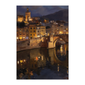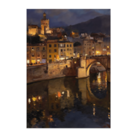 ポスター - B2この商品はpixivFACTORYで作られた商品です。サンプル画像は完成イメージのため、実物と異なる場合があります。 古い石橋と水面に揺れる光の反射が美しい、欧風の川辺の街夜景を油絵風で描いたポスターです。温かい灯りと柔らかな夜の空気が、ロマンティックで情緒ある雰囲気を演出します。お部屋に深みと輝きを添える一枚です。
