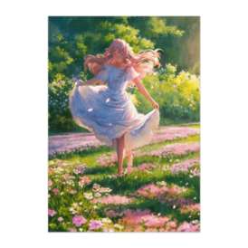 ポスター - B2この商品はpixivFACTORYで作られた商品です。サンプル画像は完成イメージのため、実物と異なる場合があります。 春の柔らかな光に照らされながら、花畑の中で白いドレスをそっと広げる少女を描いた作品です。風に揺れる髪と花びら、淡いピンクの光が重なり合い、静かで優しい世界観を演出します。自然のぬくもりを感じられる水彩油絵風ポスターとして、インテリアに最適です。
