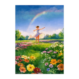 ポスター - B2この商品はpixivFACTORYで作られた商品です。サンプル画像は完成イメージのため、実物と異なる場合があります。 青空にかかる虹の下、花々に囲まれながら軽やかに踊る少女を描いた明るい作品です。春の光が降りそそぎ、花畑の色彩と白いドレスが爽やかに調和します。部屋を華やかに彩る、希望と幸福感に満ちた水彩油絵風ポスターです。