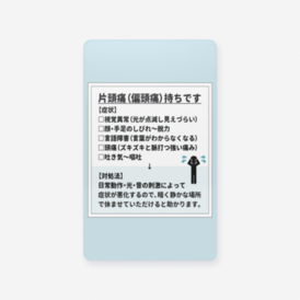 クリアカード 名刺(縦) 水色ver片頭痛(偏頭痛)持ちさん向けの、クリアカードです。 つらい症状によってうまく話せなくなり、コミュニケーションに困ることはありませんか……? 周囲の方にも理解してもらいやすいように、 症状&対処法をシンプルでイメージしやすい表現でまとめています。 具体的な症状を伝えたい場合は、 各症状説明の前にある『□』にシールやペンで印をつけて、症状の有無を示してください。 【備考】 ・個人利用の範囲でご使用いただけます。 (商用利用・商標登録・転売および再販売は禁止しています) ・本作品の著作権は放棄しておりません。 この商品はpixivFACTORYで作られた商品です。サンプル画像は完成イメージのため、実物と異なる場合があります。