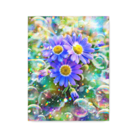 キャンバス - F6詩:冬の虹彩夢咲く祈り Joyful Solace 冴ゆる空の下 無垢な心は咲く 子らの笑みと快活さは 家族の庭に光彩を織る 夢色の景色 儚くも美しいこの時を 永遠の温もりと 絆が包み込む 冬の虹彩夢咲く祈り Joyful Solace -戎- Poetry. ”Joyful Solace” Beneath the chilling sky, An innocence unfolds and blooms. The children's laughter, bright and quick, Weaves a radiance in the family garden. A dream-hued, fleeting sight, This beautiful, brief moment now. Wrapped in eternal warmth, By threads of the deepest kinship. Winter's Rainbow Dreams Bloom Joyful Solace -Kai- God bless you. 趣旨ーーーーーーーーーーーーーーーーーーーー ## 作品制作趣旨 作者は、冬の朝の庭で、自分の娘達が楽しそうに談笑しながら庭に咲く明るく鮮やかな青紫色のシネラリア(Bluish-purple Cineraria flowers)を愛で、遊んでいる様子を思い出し描きました。 作者は、自分の娘たちが成長して行く様や、娘たちが希望に満ち溢れた笑顔で遊ぶ光景を、陽の光や虹色のプリズムで表現しています。 ## 絵画「冬の虹彩夢咲く祈り Joyful Solace」の解説 **1. 全体的な印象** このデジタル絵画は非常に鮮烈で幻想的な印象を与えます。中央に配置された鮮やかな青紫色の花と、その周囲を無数に取り囲む虹色のシャボン玉と光のプリズム効果が、現実を超越した祝福に満ちた世界を構築しています。全体の雰囲気は、希望と喜び、そして冬の清澄な空気感に満ちています。 **2. 色彩** 中心となる色彩は、青紫色と鮮やかな黄色の補色対比によって強烈なエネルギーを放っています。背景には緑の葉のテクスチャが認められますが、その上を虹色のスペクトルが覆い、光の乱反射が画面全体に多層的な色彩の深みを与えています。この虹色は、単なる装飾ではなく、作者が表現したい娘たちの希望に満ちた未来や成長の可能性を象徴しています。 **3. 構図** 構図は、中央に三輪の花を配置したシンメトリーに近い安定したものです。しかし、画面全体を覆うシャボン玉がこの安定感を打ち破り、運動と軽快さを加えています。シャボン玉の大小や配置が、視線を奥から手前へと誘導し、鑑賞者をこの光の空間の内部へと引き込む効果を生み出しています。 **4. 技法** デジタルペインティングの特性を最大限に活かし、緻密な花の描写と、光のエフェクトやテクスチャの重ね合わせという抽象的な表現技法が見事に融合しています。特に、虹色のプリズム効果や水の反射、そしてシャボン玉の透明感は、デジタル技術ならではの鮮やかさと精度で描かれています。これは、現実の観察に基づく描写と、作者の心象風景を表現する装飾的な技法が組み合わされたものです。 **5. 表現力** 作者の娘たちへの深い愛情と、彼女たちの成長に対する喜びが、光と色彩という最もダイレクトな要素を通じて力強く表現されています。花の快活さと、シャボン玉の儚さという対照的な要素が共存することで、かけがえのない一瞬の美しさ、つまり人生の尊さと永遠の願いが表現されています。 **6. 美術的価値** この作品は、写真のリアリティと幻想美術の表現力を融合させた現代のデジタルアートとして高い価値を持ちます。特に、希望や祝福という普遍的なテーマを、虹色のスペクトルという非常にポジティブな視覚言語で表現し、観る者に強い感動と安らぎ(Solace)を与える点で、その美術的意義が認められます。 **7. 作品に込められた想い** 作者は、冬の朝の光の中で遊ぶ娘たちの笑顔と、庭に咲くシネラリアの希望の象徴を重ね合わせています。娘たちが健やかに成長していくことへの祈りと、その絆が永遠に続くようにという願いが、弾けるシャボン玉の光彩に託されています。 **8. 作品の鑑賞方法** この絵画は、視覚的なディテールに留まらず、色彩と光が喚起する感情的な響きを重視して鑑賞されるべきです。花言葉の快活や喜び、そして家族愛の温もりを感じながら、冬の清澄な静寂の中での奇跡のような光の現象を体験することが、鑑賞の鍵となります。 **9. 作品の価値** 本作の価値は、個人的な慈愛の感情が普遍的な美へと昇華されている点にあります。デジタルアートとしての革新性と、家族という最も温かいテーマを扱うことによる共感性の高さから、現代の希望を象徴する作品として評価されます。 ## 詩「冬の虹彩夢咲く祈り Joyful Solace」の解説 **1. 全体的な印象** この詩は、静寂な冬の情景の中に、家族の温もりと無垢な子どもの希望が力強く輝く、叙情的でドラマチックな印象を与えます。平易な言葉で書かれていながらも、永遠や絆といった重厚なテーマが込められており、安らぎ(Solace)の感覚を伴います。 **2. 韻律** 特に厳密な定型や脚韻は見られませんが、各行が短く、二行連でまとめられた段落が四つ続く構成は、現代詩特有の散文的なリズムを持っています。最終行でタイトルに戻ることで、静かに詠まれた詩全体に、祈りと祝福の感情を凝縮させる役割を果たしています。 **3. 修辞** 表現技法として、「無垢な心は咲く」は擬人法を用いて希望や純