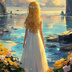 きらめく水面に反射する柔らかな光と、空いっぱいに広がる壮大な黄金色の雲が美しい、幻想的な風景を描いたイラストです。 白いシンプルなドレスを着た金髪の女性が、海辺の岩場に立ち、遠くの水平線を見つめています。光の粒が空から舞い落ち、 足元の黄色い花々が画面に彩りを添え、 まるで時が止まったような神聖な雰囲気を醸し出しています。 静かな希望や憧れ、そして広大な自然の美しさを感じさせる一枚です。 ヒーリングやスピリチュアルをテーマにしたブログのアイキャッチ、 小説や詩集の表紙、インテリア、女性向けのグッズなど、 幅広い用途でご利用いただけます。 サイズ:3000x3000px 形式:PNG(高解像度) 用途:個人商用利用 ※本作品はAIツールを使用し、色味や構図を調整しながら制作したイラストです。