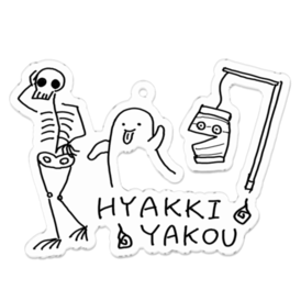 アクリルキーホルダー - 70 x 70 (mm)【ゆるい百鬼夜行】 アクリルキーホルダー 「恐ろしいはずの妖怪たちが、なんだか楽しそう……?」 日本の伝統「百鬼夜行」を、とびきりゆる〜いタッチで描き下ろしました。 骸骨(がしゃどくろ)、おばけ、提灯おばけの3体が、のんびりと夜の街を行進中。 見ているだけで心がほっこりする、癒やし系妖怪グッズです。 お出かけのカバンや鍵に付けて、彼らと一緒にゆるい散歩を楽しんでみませんか?