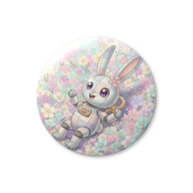 缶バッジ(バリュー) - 44mmゼンマイ⚙️仕掛けのウサギ、【パッチ🌸】のパッチワークデザインです。優しいパステルカラーで表現されたその姿は、ノスタルジックでキュート。愛と光(Love & Light)を胸に、どこか懐かしいメルヘンの世界観をお届けします。