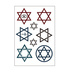 さまざまな六芒星の転写タトゥーシールです。 画面上、白地に見える部分は実際には透明になります。 貼り付けたときには、写真とは左右反転します。 2つの正三角形を組み合わせた六芒星(ヘキサグラム)という図形。六角星、星形六角形などとも呼ばれ、ユダヤ教ではダビデの星といわれイスラエルの国旗にも描かれています。日本でも「籠目」が六芒星と同様の文様で、この図柄を魔除けとて用いられています。この六芒星をアレンジした絵柄を加え、タトゥーシールにしました。 絵柄ひとつのサイズ サイズ大 高さ40~45mm、サイズ小 高さ19mm。 水で湿らせて貼り付けるだけなので簡単。はがすこともすぐできます。 タトゥーシールとして肌につける以外にも、プラスチックや金属など表面がなめらかなものに貼り付けられます。 【素材】 市販の転写シール 透明タイプ 【サイズ】 幅100×高さ148mm 【購入の際の注意点】 表面の粗いものにはきれいに転写できません。 水を使って転写させるため、紙など水に弱いものには転写できません。 肌に転写した場合は一日を目安にはがしてください。 シートは湿気を吸いやすい性質があるので、なるべく早めにお使いください。
