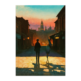 ポスター - B2この商品はpixivFACTORYで作られた商品です。サンプル画像は完成イメージのため、実物と異なる場合があります。 夕焼けに染まる静かな街並みを、ふたりで歩くひととき。 石畳に伸びる影と、遠くに灯る明かりが、 一日の終わりのぬくもりをそっと伝えます。 どこか懐かしく、少し切ない空気感を、 水彩画風のやわらかなタッチで描いた一枚です。
