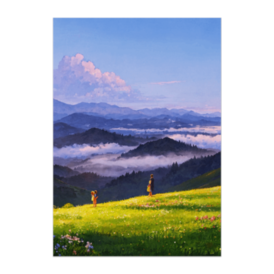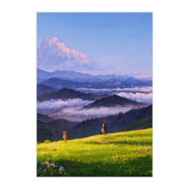 ポスター - B2この商品はpixivFACTORYで作られた商品です。サンプル画像は完成イメージのため、実物と異なる場合があります。 朝の光に包まれた草原の丘。 霧に浮かぶ山々を前に、家族が静かに立ち尽くします。 自然の広がりと、心のつながりを感じさせる一瞬を、 水彩画風のやさしい色彩で表現しました。