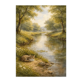 ポスター - B2この商品はpixivFACTORYで作られた商品です。サンプル画像は完成イメージのため、実物と異なる場合があります。 静かに流れる小川と、緑に囲まれた穏やかな風景。 そのそばでくつろぐ猫の姿を、 水彩油彩風のあたたかなタッチで表現しました。 自然の音が聞こえてきそうな、 落ち着いた癒しの一枚です。