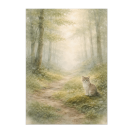 ポスター - B2この商品はpixivFACTORYで作られた商品です。サンプル画像は完成イメージのため、実物と異なる場合があります。 やわらかな霧に包まれた森の小道。 その中で静かに佇む猫を、 淡い色彩の水彩油彩風で描きました。 幻想的でありながら、 安心感のある穏やかな一枚です。