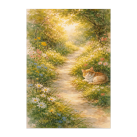 ポスター - B2この商品はpixivFACTORYで作られた商品です。サンプル画像は完成イメージのため、実物と異なる場合があります。 色とりどりの花に囲まれた、やさしい小道。 そのそばでくつろぐ猫の姿を、 明るく温かな水彩油彩風で描きました。 見ているだけで心がほぐれる、 やさしさあふれる作品です。