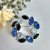 お気に入りのリースデザインブローチ、長義くん版です。 もっと早く作っても良かった。 派手過ぎない深い青に、合わせているスワロフスキーのクリスタルビジューは内側から薄っすら青い光と影が浮かぶような加工がされていて、とても綺麗です。 外周約35mm。 マフラーを留めたりコートの襟飾りにと、色々役立ちます。 ●アレルギー対応商品について 当店ではピアス、イヤリング、チェーン、アジャスター等にサージカルステンレス316を使用時明記しております。 体質には個人差がありますので、必ずしもアレルギーが出ないという保証ではございません。 樹脂ピアスも取り扱っておりますので、そちらもご検討下さい。 ●色褪せ・錆について ステンレス以外の、錆びやすい材質のパーツとの組み合わせの場合、そのパーツの錆びがステンレス表面に付着し「もらい錆」により錆びてしまうケースがございます。 その際は錆びをすぐに除去するようにしてください。 また、水に濡らしたりアルコール・汗等が付着しないようご注意下さい。 ●レジン作品について レジン作品は非常に繊細な為、強い衝撃を与えたり、高温・直射日光に長時間さらさないようご留意下さい。 また、水濡れやアルコール、汗などは劣化の原因となる為、触れないようにご注意下さい。 ●天然石について 当店では天然石を使用している場合、その種類を明記しております。天然石の一部は長時間の直射日光や水分に弱いものが多いです。アクセサリー用に加工されているものを仕入れておりますが、水に濡らしたり長時間直射日光にさらさないよう、ご注意下さい。