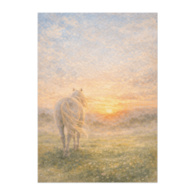 ポスター - B2この商品はpixivFACTORYで作られた商品です。サンプル画像は完成イメージのため、実物と異なる場合があります。 朝の光に包まれながら、静かに遠くへ歩いていく白馬。 振り返らず、ゆっくりと前へ進む姿に、 これから始まる一年の時間と未来を重ねました。 語りすぎない構図と、やわらかな色彩が、 見る人の心にそっと余韻を残す一枚です。