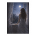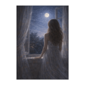 月夜の窓辺に立つ女性|静かな夜想の油絵風ポスター