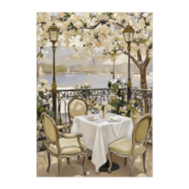 花に囲まれた川辺のテラス ― ロマンティックオイルペインティング風