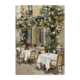 ポスター - B2この商品はpixivFACTORYで作られた商品です。サンプル画像は完成イメージのため、実物と異なる場合があります。 パリの街角を思わせる歩道に、白いテーブルクロスとクラシックな椅子が並ぶ情景。建物の淡いクリーム色と、頭上を覆う花のアーチがやわらかく溶け合い、静かな旅情を誘います。ブランド表記のない、鑑賞者視点のインテリア向けペインティング風アート作品です。